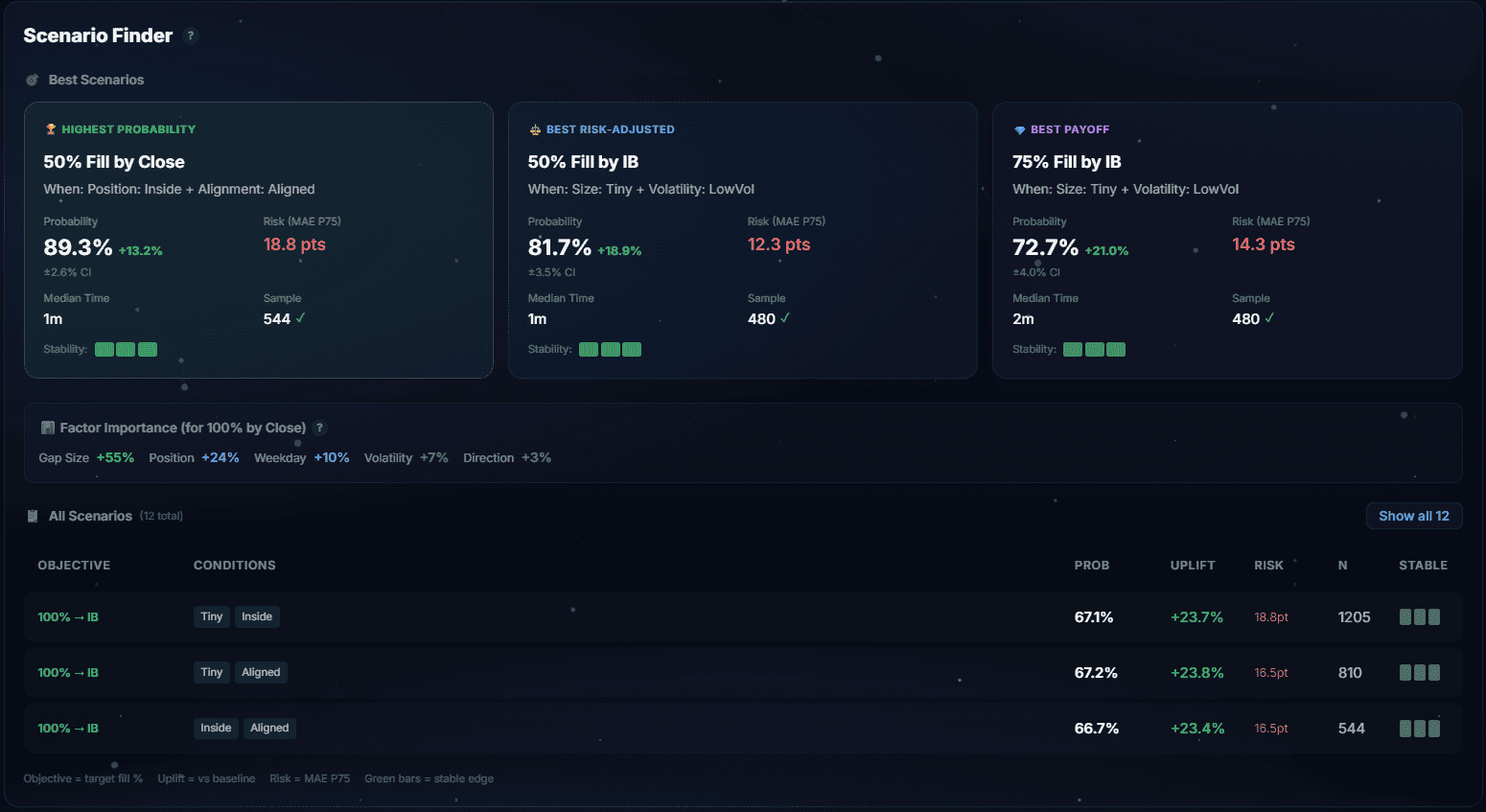 You can filter by custom date ranges, combine conditions, and explore how gap fill probability shifts for specific contexts. The tool shows the full fill ladder, timing distributions, MAE profiles, and ranked multi-condition scenarios.