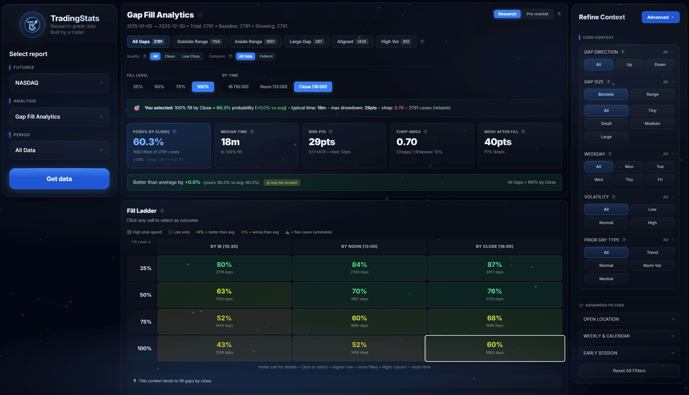 All the gap fill statistics in this article come from our Gap Fill Analytics tool. It runs these calculations for NQ, ES, and other futures instruments with filters for every factor discussed above — gap size, direction, open location, day of week, volatility regime, and more.