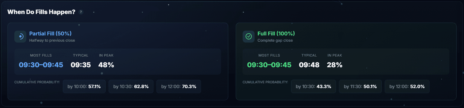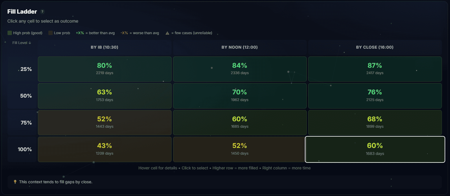 - Fill Chances — gap fill probability of reaching each fill level (25/50/75/100%) by 10:30, Noon, and Close, specific to your gap’s context