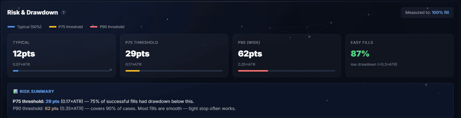 MAE (Maximum Adverse Excursion) — how far price moves against the fill direction before filling. If you’re fading the gap on a gap up, how much does price push higher before coming back down?