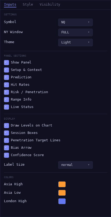 ⚠ Disclaimer — This session trading indicator provides statistical probabilities based on historical futures data. It does not generate buy/sell signals and should not be used as the sole basis for trading decisions. Past performance does not guarantee future results. NQ statistics should not be applied to ES and vice versa. Always use proper risk management.
