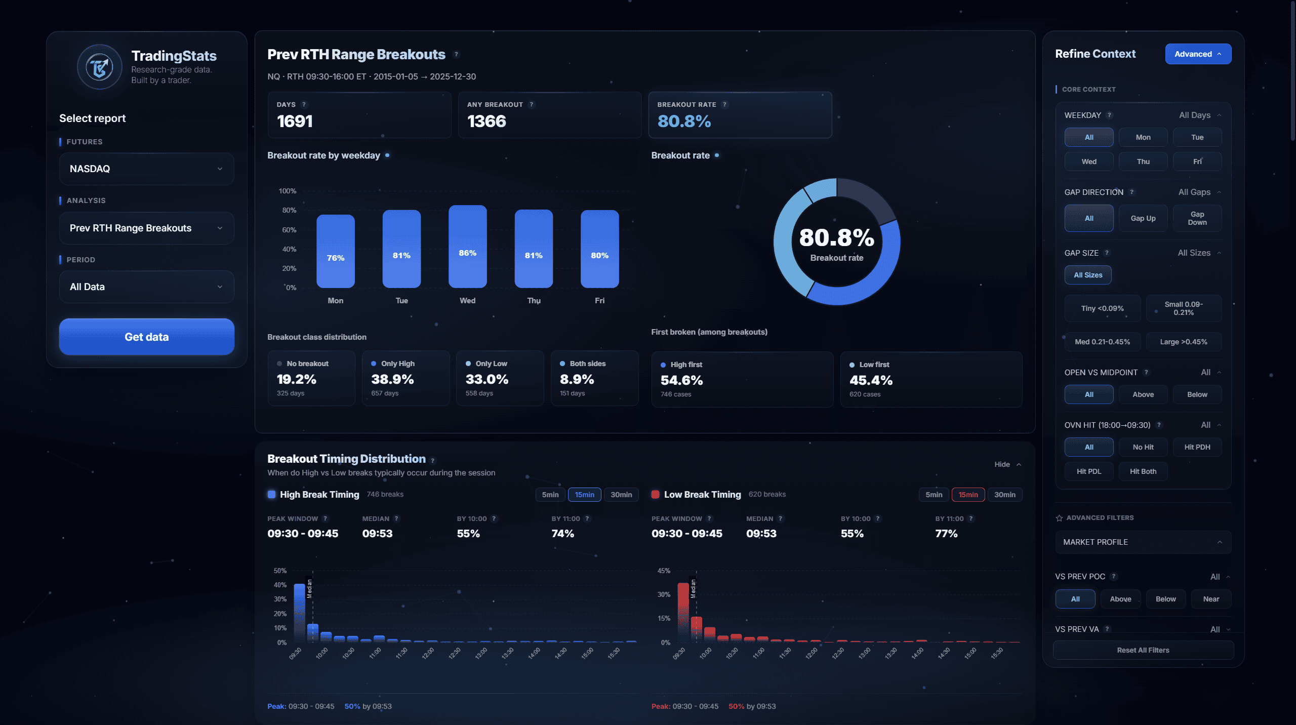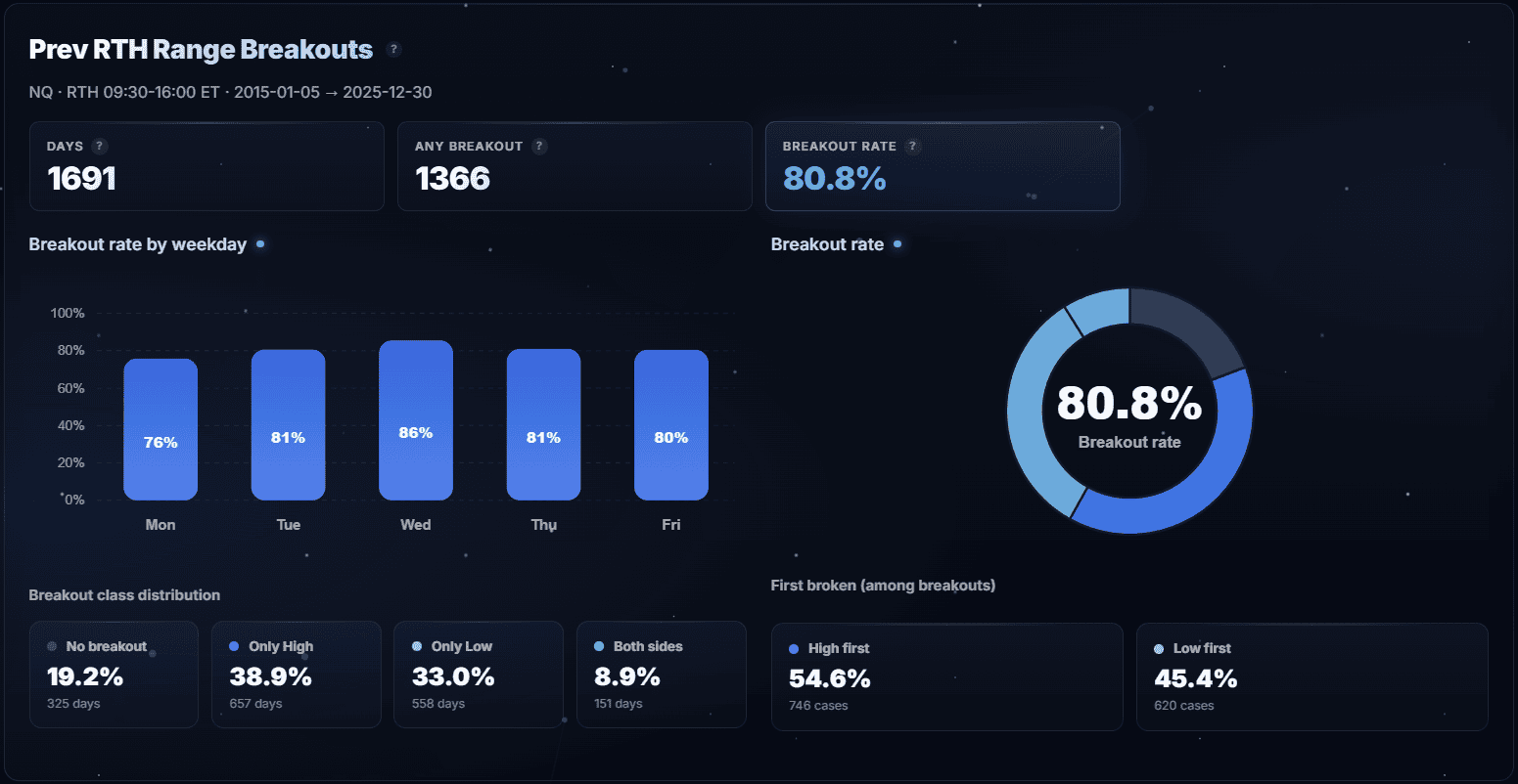 All the statistics in this article come from our Previous RTH Range Breakouts analysis tool. It runs these calculations for NQ, ES, YM, and other futures instruments with filters for every factor discussed above — day of week, gap direction, overnight activity, Value Area position, and more.
