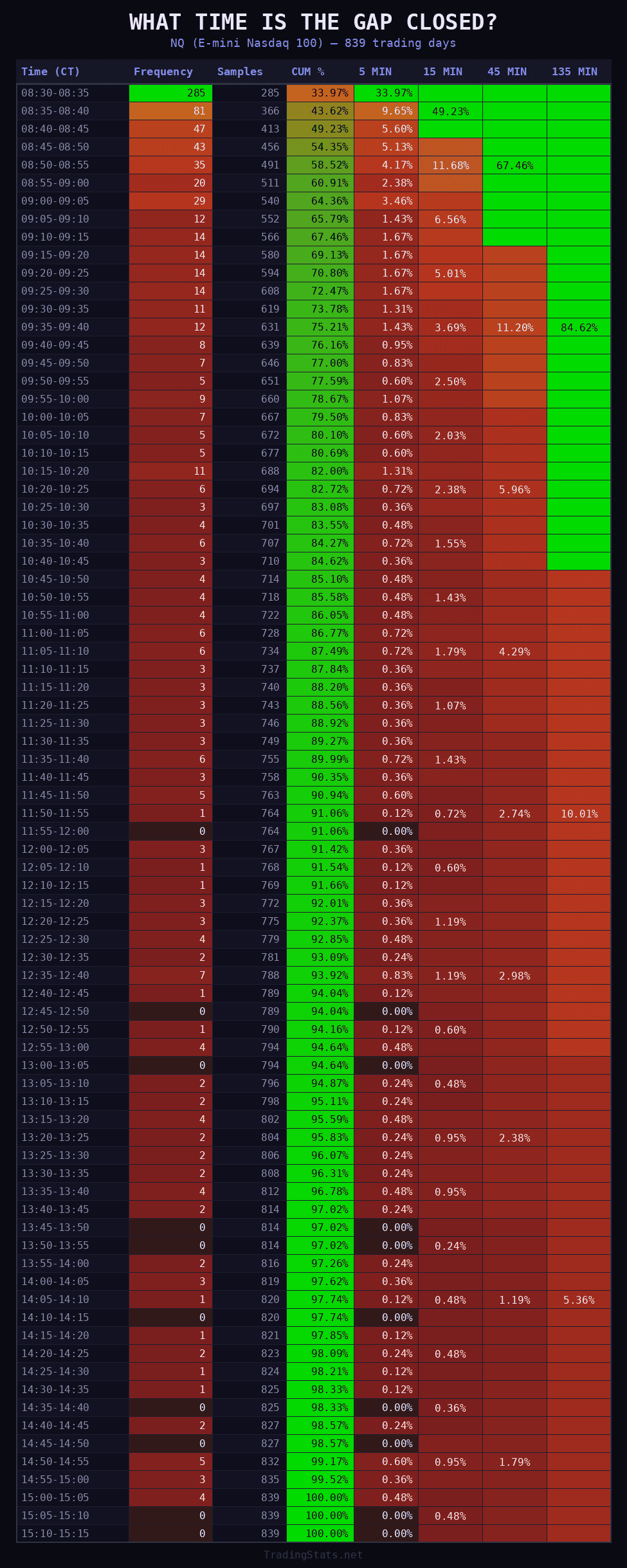 NQ highlight: 285 out of 839 gap fills (34%) happen in the first candle. By 8:45 CT — just 15 minutes in — nearly half of all NQ gap fills are complete. The 45-minute block starting at the open captures 67.5% of all fills.